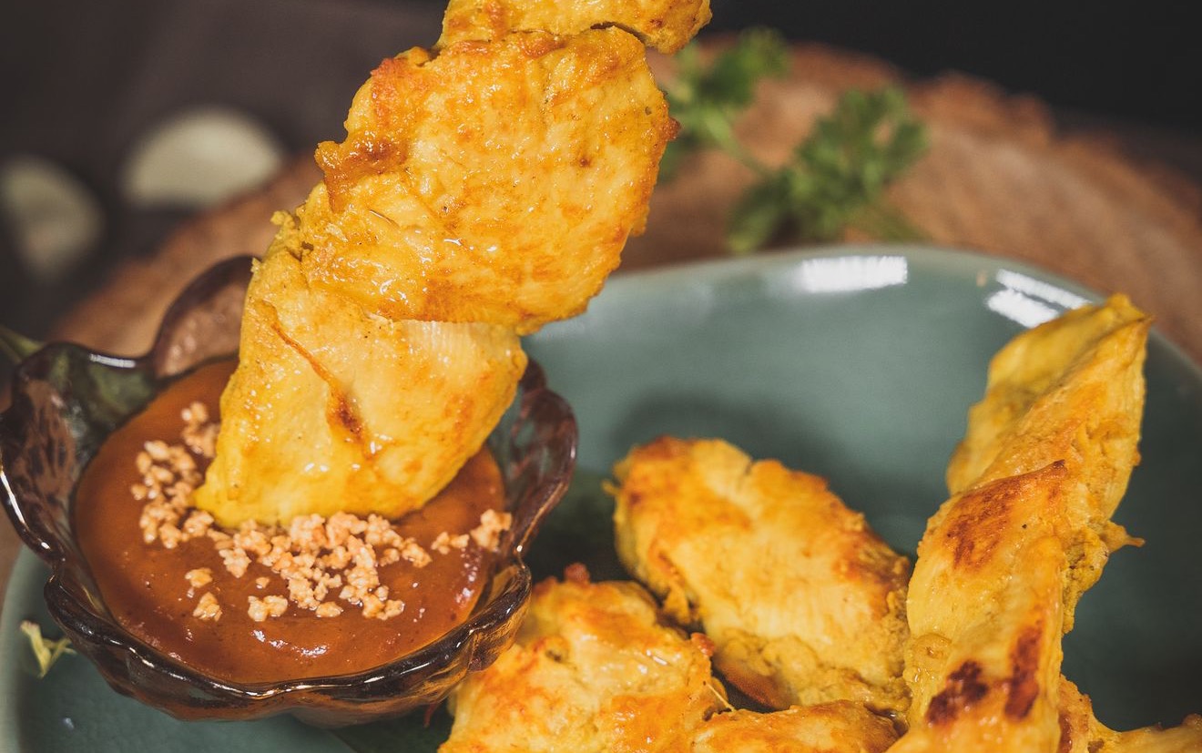 Grilled coconut milk marinated chicken breast on the skewer, served with peanut sauce.